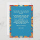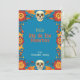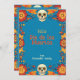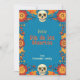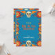 La "Eternal Blossoms Tribute Card" para Dia de Muertos cuenta con un vibrante fondo azul bordeado por flores naranjas y rojas con dos cráneos decorativos en la parte superior e inferior. El texto central dice "Feliz Dia de los Muertos" en negrita, amarillo, seguido de "de [nombre personalizado]" indicando el área de nombre del remitente del personalizable. La parte posterior de la tarjeta probablemente refleja la parte delantera con espacio para un mensaje personalizado contra el mismo fondo floral azul.