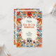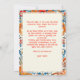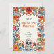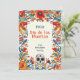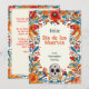La "Vibrante Tarjeta de Tradiciones - Día de los Muertos" presenta un cráneo decorado y vibrantes patrones florales con texto de personalizable, incluido "Feliz Día de los Muertos" en la parte superior y "desde [nombre personalizado]" en la parte inferior, con espacio en la parte posterior para un mensaje personalizado y el mismo fondo floral que el frente.