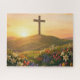 Celebrate the peace and promise of Easter with this breathtaking spiritual landscape. This high-quality jigsaw puzzle features a sturdy wooden cross standing atop a serene green hill, illuminated by the golden glow of a rising sun. The winding path leads the eye toward the horizon, symbolizing a journey of faith and renewal.