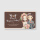 This is a digital wedding invitation or greeting card design. It features watercolor illustrations of a bride and groom in a warm, pastel color palette, primarily brown, cream, and pink. The illustration style is whimsical and cute, depicting the couple from the waist up, with the bride holding a floral bouquet and wearing a flower crown. The background is a simple, dark brown panel. Decorative white elements, possibly representing doves or intertwining rings, are at the top, along with flowing calligraphy text