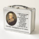 Si te gusta la libertad, disfrutarás de esta metalizado y filosófica carta de almuerzo con el Padre Fundador Thomas Jefferson. La cita dice: "Preferiría estar expuesto a los inconvenientes que conlleva demasiada libertad, que a los que asisten a un grado demasiado pequeño". ¡Almuerzo para cualquiera a quien no le importe tener demasiada libertad!