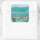 Pegatina de fotografía de recuerdo con un tiburón persiguiendo peces mariposa en el agua azul transparente de la laguna de la isla tropical del pacífico Bora del archipiélago de Tahití, Polinesia Francesa. Encima del agua se encuentran los bungalows sobre el agua.