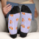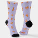 Un tigre pequeño y marrón con puntos de polka verde sobre el diseño de fondo morado.