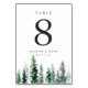 Las tarjetas numéricas de la tabla de moda de los bosques de invierno cuentan con una agrupación de pinos acuarelas en verde cazador y verde salado. Personalice con cada número de tabla, con sus nombres y fecha de boda debajo. El diseño se repite al revés. Coordina con nuestra suite de invitados a la boda Timber Grove.