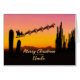 Una tarjeta de Navidad para tu tío que muestra a Santa volando sobre el desierto. Se ven muchos cactus altos en silueta. Desee una feliz Navidad desde el desierto con una hermosa tarjeta de color puesta de sol.