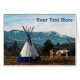 Imagen de un nativo americano y su caballo cerca de un tipi en el noroeste del Pacífico. La nieve se ha asentado en las laderas altas de las montañas en el fondo. Añade tu propio texto.