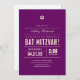 Invitaciones elegantes púrpuras majestuosas de Mitzvah del palo con la estrella de David. Personalice la fraseología para su celebración.