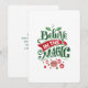 Tarjeta de vacaciones plana con una ilustración adorable. El texto dice Cree en la Magia en letra elegante. Decorado con bolas de navidad.