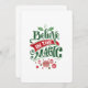 Tarjeta de fiesta plana con una ilustración adorable. El texto dice Cree en la Magia en letra elegante. Decorado con bolas de navidad.