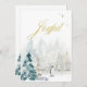 Escena de Navidad elegante acuarela follaje bosque nieve con pingüino encantador. Tipografía cursiva elegante en dorado "Alegre" Acuarela en verdes y azules.