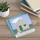 Una tarjeta de felicitación personalizada para un nuevo propietario, con un diseño encantador que celebra la alegría de una nueva casa. La pieza central es una tipografía creativa que muestra frases conmovedoras sobre el hogar, bellamente colocadas en una foto pintoresca de una casa adornada con un corazón, un pájaro alegre en el patio delantero y un vibrante cielo azul. El diseño también incluye un campo de tipografía de personalizable, lo que permite que los mensajes personales u otras personalizaciones únicas hagan la tarjeta aún más especial. © Wafa Y. Dahdal - Reservados todos los derechos. Arte de WD