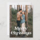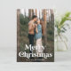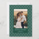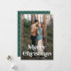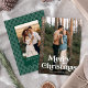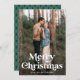 Elegante tarjeta de vacaciones de moda que muestra tu foto de sangre completa con "Feliz Navidad" en una superposición de tipografía blanca de estilo retro. Personalice la parte delantera de la tarjeta fotográfica de vacaciones agregando su nombre/nombre comercial, el año u otro texto personalizado. La tarjeta se revierte para mostrar una segunda foto y el mensaje de su personalizado con un fondo con forma de semicírculo verde y blanco.