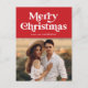 Elegante y moderno postal de fotos navideñas con "Feliz Navidad" en la parte delantera, con un fondo rojo y un fondo blanco retro. Personalice la parte delantera de la tarjeta postal de vacaciones añadiendo su nombre y foto. La tarjeta postal se revierte para mostrar la dirección de retorno y el mensaje de personalizado en texto rojo. Diseñado para coordinar con nuestra colección de tarjetas de Navidades de tipografía retro.