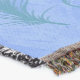 Bonita manta de tiro con susurros de plumas verdes de fondo azul.