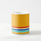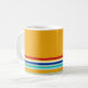 Una taza amarilla de colores vivos con rayas en el fondo en verde rojo y agua.