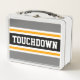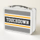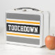 Este diseño deportivo y colorido presenta texto atlético TOUCHDOWN dentro de una banda central negra resaltada con rayas de carreras blancas y amarillas contra rayas externas grises. El texto y los colores de este diseño se pueden personalizar.