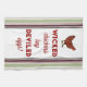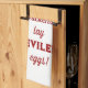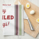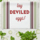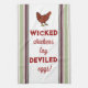 Esta toalla de cocina tiene rayas a lo largo de ambos lados, una gallina y "¡Las gallinas malvadas ponen huevos desviados!" debajo. Crédito de arte: RedPepper. ¡Disfruta de tus nuevas franjas y toalla de cocina de pollo malvado!