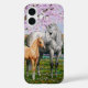 Una yegua de caballo gris manzana y su palomino parados en un campo verde de hierba cubierta de flores silvestres de primavera coloridas. En el fondo hay un gran y hermoso cerezo cubierto de flores rosas y rodeado de azaleas y rododendros florecientes. Obra de arte realista creada a partir de una pintura al óleo original de la vida silvestre y la artista equina Crista S. Forest.