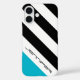 Este moderno y moderno funda personalizado en blanco y negro para el iPhone es una gran protección y decoración para tu nuevo teléfono móvil. El diseño de rayas diagonales es moda, elegante y llamativo. El toque de azul acuático añade emoción. Nombre fácil de personalizar. Todos los derechos reservados © 2024 Alan & Marcia Socolik.