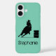 El delicioso ilustracion rústico de rodeo a paso rápido. Silueta de una carrera de barril de cowgirl con su caballo. El fondo es un color verde menta de moda. Ideal para los amantes del rodeo y de los caballos.
