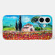 Paisaje toscano, colorido, vibrante, expresiva belleza del campo italiano y campos en naranja amarillo brillante, rosa, fucsia, púrpura, rojo, verde, marrón, amarillo, hermosa flora de verano, prados, flores, cipreses y olivos, antigua granja rústica bajo el cielo azul. Pintura acrílica sobre lienzo.