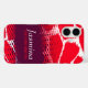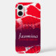 Estuche de iphone con estampado animal brillante en audaces tonos rojo, blanco y violeta. Personaliza este elemento con tu nombre completo. Este ejemplo actualmente dice: Jasmina Henderson. © Diseño original del patrón de Sarah Trett, se basa en el patrón encontrado en una jirafa con un superpuesto de media tonalidad moiré punto de ganancia.