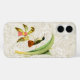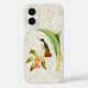 Estuche de teléfono con un ilustracion vintage de un colibrí de Azure Crowned. Un colibrí verde y dorado con la cabeza azul y la garganta blanca sobre una orquídea rosa Cattleya guttata, con un fondo de textura de mármol dorado claro.