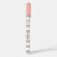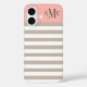 Vestir y proteger tu iphone con un diseño sencillo, moderno y elegante a rayas que es monogramado por personalizado con tus iniciales de primer, medio y apellido en una fuente serif preppy. El color beige/taupe neutro y las franjas horizontales blancas contrastadas con un fondo de bloque de color rosa/melocotón claro. Texto gris oscuro y cálido.