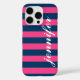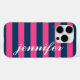 Vestir y proteger tu iphone con un diseño de patrones de rayas preppy, moderno y audaz que es monogramado por personalizado con tu nombre en letra de guión bajo. Bandas horizontales negras / azul índigo y magenta caliente contrastadas con texto blanco.