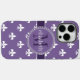 Patrón de fleur de lis (lirio francés) intemporal y sofisticado combinado con una cinta de acento y estribillo para que puedas personalizar con tu primer nombre y el último inicial. Elija entre una amplia variedad de combinaciones de colores en este diseño. Se muestra aquí en morado medio y oscuro y blanco. Creado por Holiday Hearts Designs for HHTrendyCases.