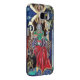 Colorido, vibrante , pintura contemporánea en oro, azul, rojo, verde, marrón . Un misterioso hechicero hipnótico con elegantes trajes de terciopelo rojo que sostienen una mágica esfera sentada en un trono gótico con gargantas y un búho. El ambiente es surrealista, fantástico, alquímico, donde se ve a un bufón bebiendo de una taza, un monje templario volando sobre una rana, burbujas transparentes, paisajes fantásticos con fuego infernal, cielo azul cósmico con estrellas, montañas del cielo, árboles. Huevo Tempera en un panel de madera con Relieve metalizado dorado. 1989 , Miniatura Hecha con técnicas pictóricas de 1300 por Alessandro Lumini (c) También es un hermoso diseño de fantasía para Navidades, vacaciones, cumpleaños, día de Nochevieja, Mardi Gras y saludos de carnaval.