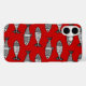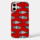 Estuche de teléfono en un patrón de peces retro moderno, caprichoso, en tonos gris plateado claro / gris a gris grafito profundo sobre un fondo rojo de lápiz labial profundo