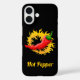 Pimienta picante roja con círculo de llama sobre fondo negro. Texto personalizado.