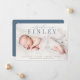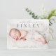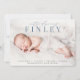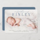 Un elegante diseño de anuncio de nacimiento con una foto horizontal o paisajista completa con "presentando [nombre]" en la parte superior del guión de caligrafía de moda y letras clásicas del serif. El nombre completo de su bebé, las estadísticas de nacimiento y su firma familiar aparecen en la parte inferior. Añade tres fotos cuadradas adicionales a la parte posterior.
