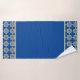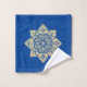 Esta toalla de baño tiene medallones de oro y melocotón en un fondo azul. Están hechos para coordinar con la cortina de ducha y la alfombra de baño a juego. Este medallón está basado en una cerámica real. por el fabricante de baldosas de Oregón Fay Jones Day