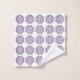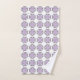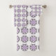 "Toallas estampadas exhibidas, con un diseño repetitivo de formas florales púrpuras con contornos negros sobre un fondo blanco. La imagen superior muestra la toalla colgada de una barra, mientras que la imagen inferior muestra una toalla de lavado doblada. El diseño transmite una estética limpia y decorativa."