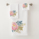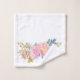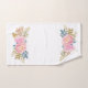 Elegante toalla de baño adornada con delicadas flores acuáticas en tonos rosa pastel y melocotón con tonos verde y azul/gris sobre fondo blanco. Muy decorativo y romántico.