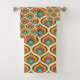 Toalla de baño moderna de mediados del siglo. Patrón de llama. Colores rojos, turquesas, amarillos y marrones.