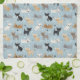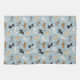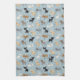 Perros chihuahua con abrigos negros, marrones, tan, crema, grises y azules sentados y parados con huesos de perro dispersos y huellas de pata sobre un fondo azul claro.