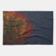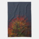 Mirando hacia arriba a través de las ramas de un árbol que se alza en otoño. Las hojas que caen de burdeos, rojos, dorados, naranjas, amarillos y azules brillan contra el cielo azul profundo.
