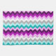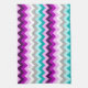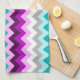 Una toalla de cocina con un bonito y colorido diseño de chevrons en ciruela púrpura, lila, blanco, minty verde azulado, turquesa y gris.