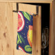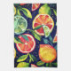 Toalla de cocina con imagen de cítricos sobre un fondo estelar azul oscuro.