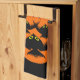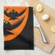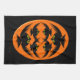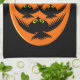 Esta increíble toalla de cocina presenta una ovalo naranja con seis cuervos dentro. Cada cuervo tiene ojos amarillos con pupilas negras y alas extendidas. Los cuervos vuelan hacia el otro formando una forma ovalada. El fondo es negro.