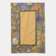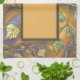 Toalla de cocina con hojas ondulantes como borde, hojas de un arbusto de frambuesa. Colores de verdes, verde oliva, oro de camello, vara dorada, perinela oscura, perwinkle, marina.
