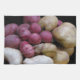 Esta toalla de cocina de la fotografía de la bella arte ofrece las porciones de patatas orgánicas coloridas, apenas cosechadas y preparadas, en colores de rojo, de púrpura, de rosado, de amarillo, de marrón y el blanco. Cada patata tiene su propia forma única.