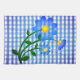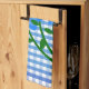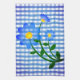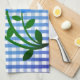 Toalla de cocina con la imagen de un ramo de flores azules sobre un fondo de gingham azul y blanco.