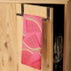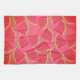 Toalla de cocina con trozos de sandía colocada sobre un fondo rosa.