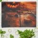 Toalla de cocina con una linterna Jack O' de Halloween rodeada de hojas caídas.