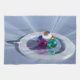 Una imagen en 3D creada en Vue, llena de reflejos y luces brillando desde todas direcciones. Cinco esferas de colores de vidrio azul, rosa, turquesa, naranja y diamante se asientan en una pirámide rodeada por un anillo blanco translúcido. Se sientan sobre un fondo alucinante de rayos azul y blanco pálidos que convergen justo debajo de las cinco bolas de cristal.