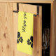 Las patas delanteras de un gato polidáctilo (7 dedos) se dirigen al centro de la toalla desde los bordes cortos. "Limpia tus garras" es el texto que se muestra. Fondo amarillo.